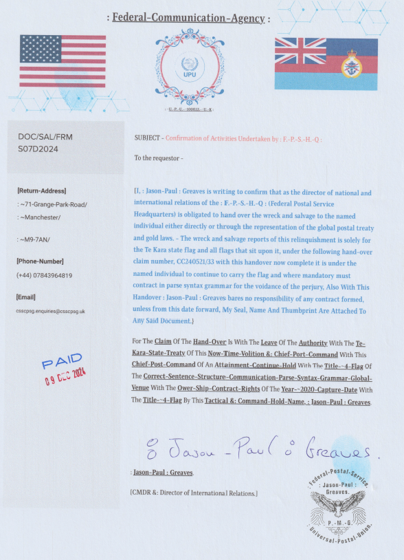 This document outlines a treaty between two sovereign nations: the Crown of the Mauri Nation and the Sovereign Nation State of Éire (Ireland). The treaty, dated September 28th, 2024, establishes mutual recognition, cooperation, and shared governance. Key aspects include: *Core Claims and Agreements:* * *Mutual Recognition of Sovereignty:* Both nations acknowledge each other's sovereignty and authentic values. * *Joint Trust and Command:* A joint trust motion asserts ownership, duty, and command over the treaty and its documentation. * *Historical Context:* The treaty explicitly references various historical treaties, declarations, and legal claims related to the sovereignty of indigenous Māori in Aotearoa (New Zealand) and the historical claims of Éire. These include He Whakaputanga o te Rangatiratanga o Nu Tireni (1835), Te Tiriti o Waitangi (1840), and other key documents highlighting significant milestones in the history of both nations. * *Lodial Land Claims:* Both nations assert claims over specific lodial (ancestral) lands within their respective territories. * *Appointment of Postmasters:* John Flanagan is appointed as Postmaster General for both nations. * *Now-Time Claims:* The treaty utilizes the term "Now-Time" to emphasize the current and ongoing validity of the claims made. * *Global Postal Treaty Compliance:* The treaty adheres to rules related to the Global Postal Treaty, encompassing syntax and grammatical structures. *Key Individuals and Entities:* * *Lady-Crown-Turikatuku-111:* A central figure in the treaty, seemingly representing a significant role in asserting both Crown claims. * *Jason-Paul Greaves:* Identified as the Global Chief Post Master General, playing a significant role in verifying and endorsing the treaty. * *Mauri Crown & Eire Crown:* The treaty acknowledges the sovereignty and authority of both Crown entities. *Geographical Context:* The treaty includes maps illustrating the Maritime Limits of both New Zealand and Éire. *Disclaimer:* This summary is based on the provided text. The legal implications and full details of this treaty require expert analysis. For legal or official interpretations, consultation with relevant legal professionals is recommended.