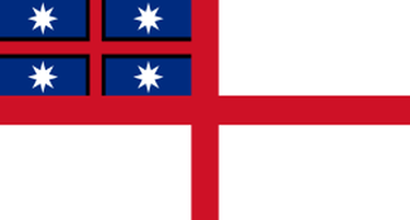 - Description: White background field; a red St George's Cross. In the upper canton next to the staff, on a blue field, a smaller St George's Cross in red, severed from the blue by a fimbriation of black half (a narrow black border) the width of the red, and, in the centre of each blue quarter, a white 8 pointed star.