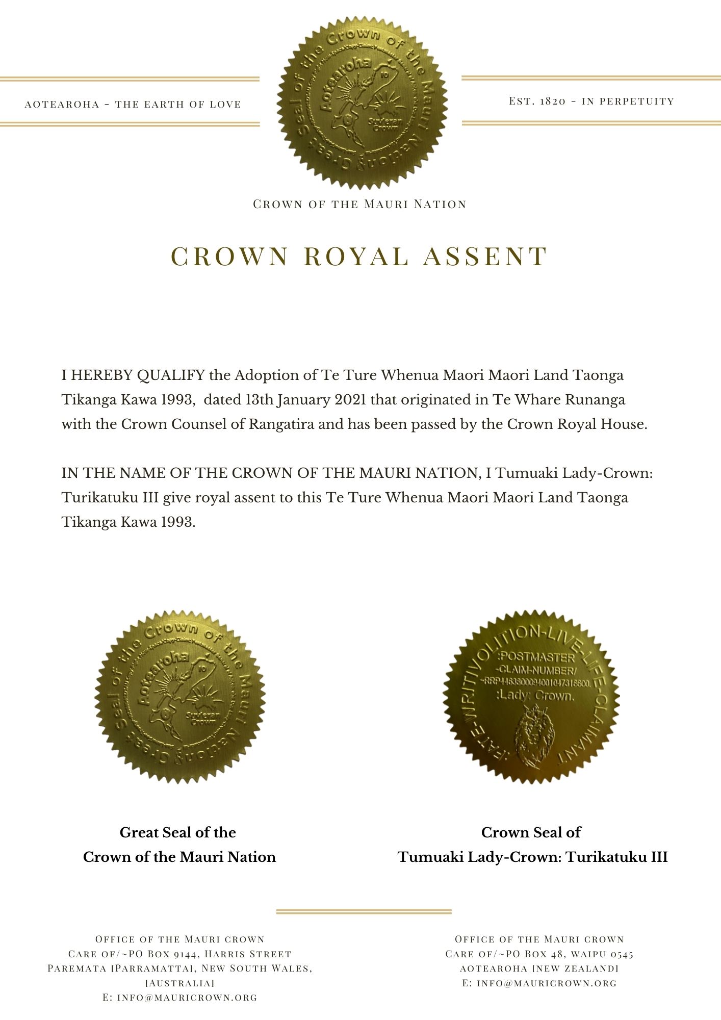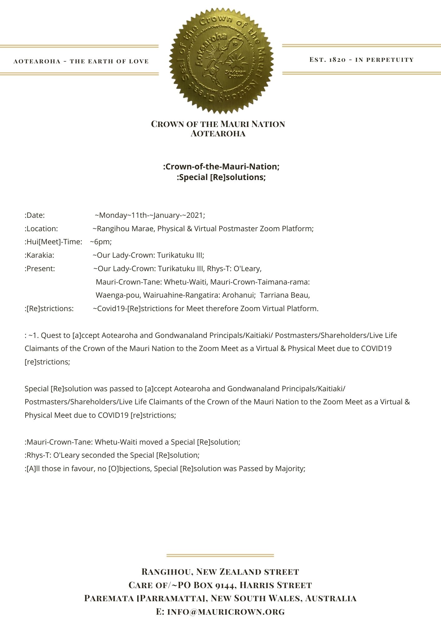 The Sovereign Crown of the Mauri Nation adopted Lores, Laws and any & all of the acts, as proclaimed in Special Resolutions dated 11th January 2021; to constitute, order and declare; revoke; authorise and empower; execute all the rights, powers, privileges and authorities; instruct the provision for the publication and the coming into operation and the coming into force; and execute all rights, powers, privileges and authorities of absolute Sovereignity as we see fit in alignment with 13th November 1820 Sovereign Proclamation by Ariki Hongi Hika to King George IV and to the Nations of the World in perpetuity.