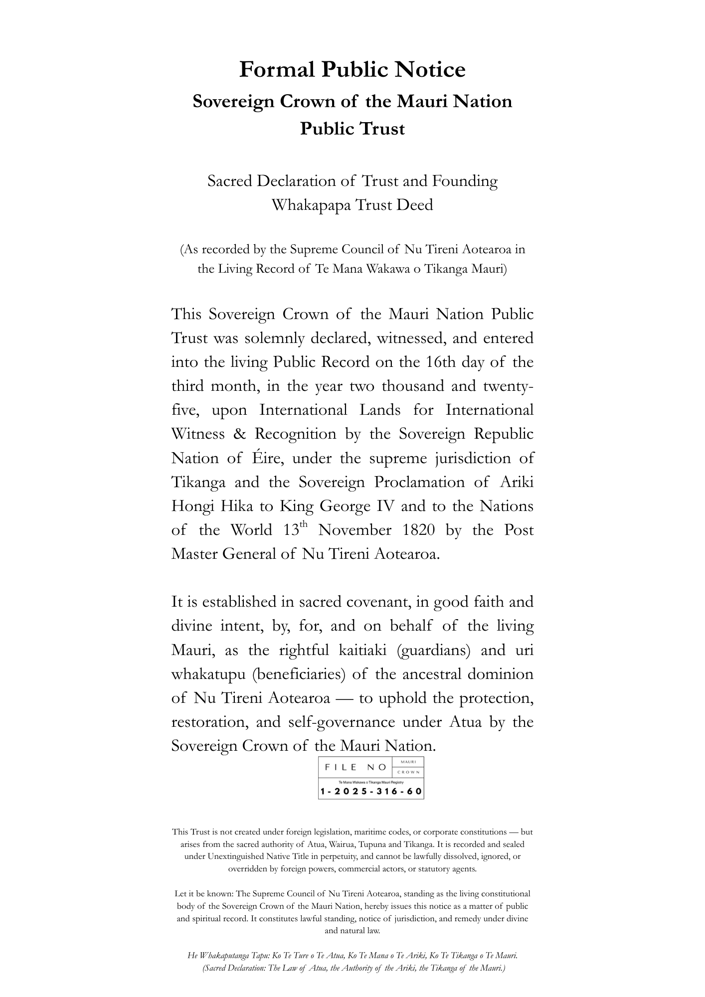 Instead, it is: Sealed under Tikanga, Anchored in the 1820 Proclamation by Ariki Hongi Hika to King George IV, Upheld by the Living Supreme Council of Nu Tireni Aotearoa.